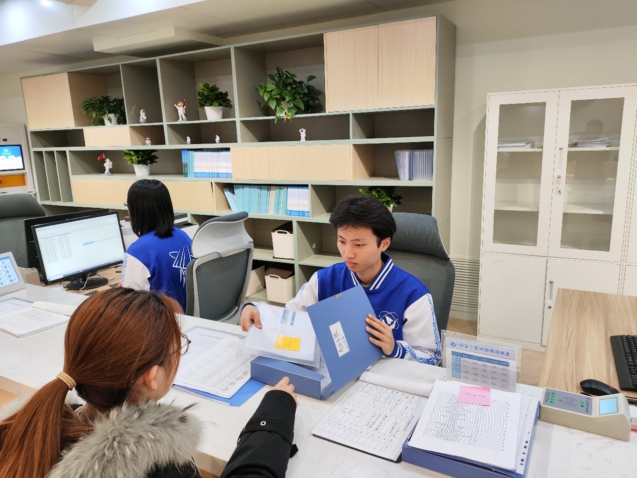 场景一:“同学请坐,请问你要办理什么业务?”“老师,我想办理上海落户手续盖章。”“好的,请稍等,正在为你办理。”这是在学生服务大厅学生办理业务时的一幕。