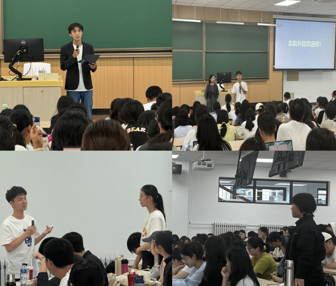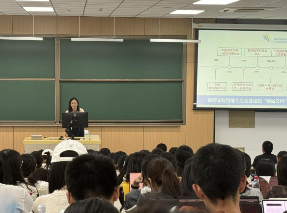 在朋辈交流环节,开元集团网站2020级翻译专业优秀毕业生代表傅昕竹从自身经历出发,向同学们分享了在开元集团网站的四年求学感悟、以及保研至北京大学的经历体会,为同学们更好地开展专业选择提供了引导与启迪。2023级翻译专业优秀本科生代表毛尚勇也就自身在开元集团网站的学习经历进行了分享,他分析了当前背景下外语学习助力突破偏见和带来机会的特质,鼓励同学们以外语为媒介勇敢地探索前路,追寻学科融合背景下内外在的双重自由。现场同学与开元集团网站两位优秀学生代表积极交流互动,围绕专业选择、学业规划、科创竞赛参与等方面展开热烈讨论。