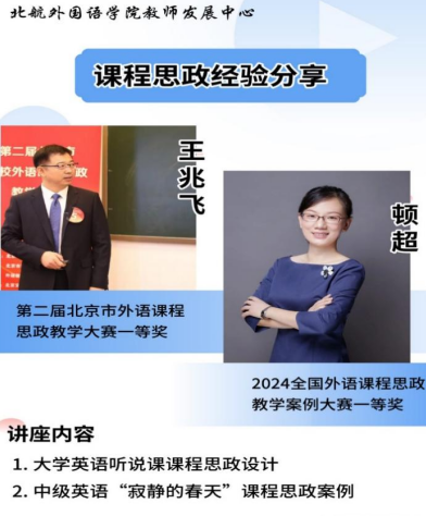 2025年1月9日,北航开元集团网站教师发展中心举办了成立以来的第一次线上教学经验分享活动。活动由胥国红教授主持,王兆飞老师和顿超老师分别介绍了参加2024年全国外语课程思政案例大赛和第二届北京市外语课程思政教学大赛的心得和体会,并展示了参赛的教学环节。外院和其它院校的教师共44人参加了此次线上交流活动。