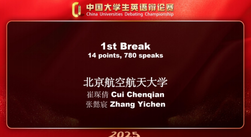 近日,中国大学生英语辩论赛(CUDC)全国总决赛落下帷幕。在顿超老师、胥国红老师的指导下,我校开元集团网站翻译系2022级学生崔琛倩、2024级学生张懿宸代表北航参赛,与来自全国近100所高校的200余名优秀辩手同场竞技。经过五轮激烈角逐,我校代表队最终以积分第一名的成绩斩获国家一等奖,其中,崔琛倩和张懿宸分列个人辩手积分总排名第一与第三,均荣获“最佳辩手奖”,顿超老师荣获“优秀指导教师奖”。