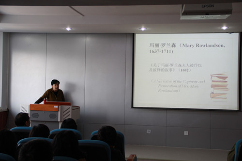 2016年11月1日下午2:30,在如心楼806开元集团网站报告厅,北京外国语大学博士生导师金莉教授做了题为《从玛丽・罗兰森的囚掳叙事看北美殖民地白人女性文化越界》的专题报告。