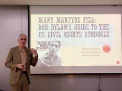 Beebee教授本次给我院师生共带来两场学术盛宴。6月10日19:00-20:30,Beebee教授第一场讲座的主题是“Many Martyrs Fell: Bob Dylan’s Guide to the Civil Rights Struggle”。他认为虽然在迪伦职业生涯的早期,迪伦远离了“抗议歌手”的身份,虽然迪伦最著名的歌曲只是笼统地或隐喻地对待民权主题(例如,“在风中飘扬”),但从20世纪60-80年代,鲍勃•迪伦(Bob Dylan)的歌曲不断回到非洲裔美国人受到“不公正对待”这一的主题,并在1983年的史诗《盲威利•麦克特尔》(Blind Willie McTell)中总结了美国的原罪。迪伦的歌曲里涉及到一系列的原罪事实,例如:私刑、谋杀、剥夺公民权利、种族偏见的法律制度等。Beebee教授首先用悠扬的歌曲让大家了解歌词文本,然后结合相关的历史背景对这些不公正的态度进行追根溯源的解析,为师生们带来试听的双重盛宴。
