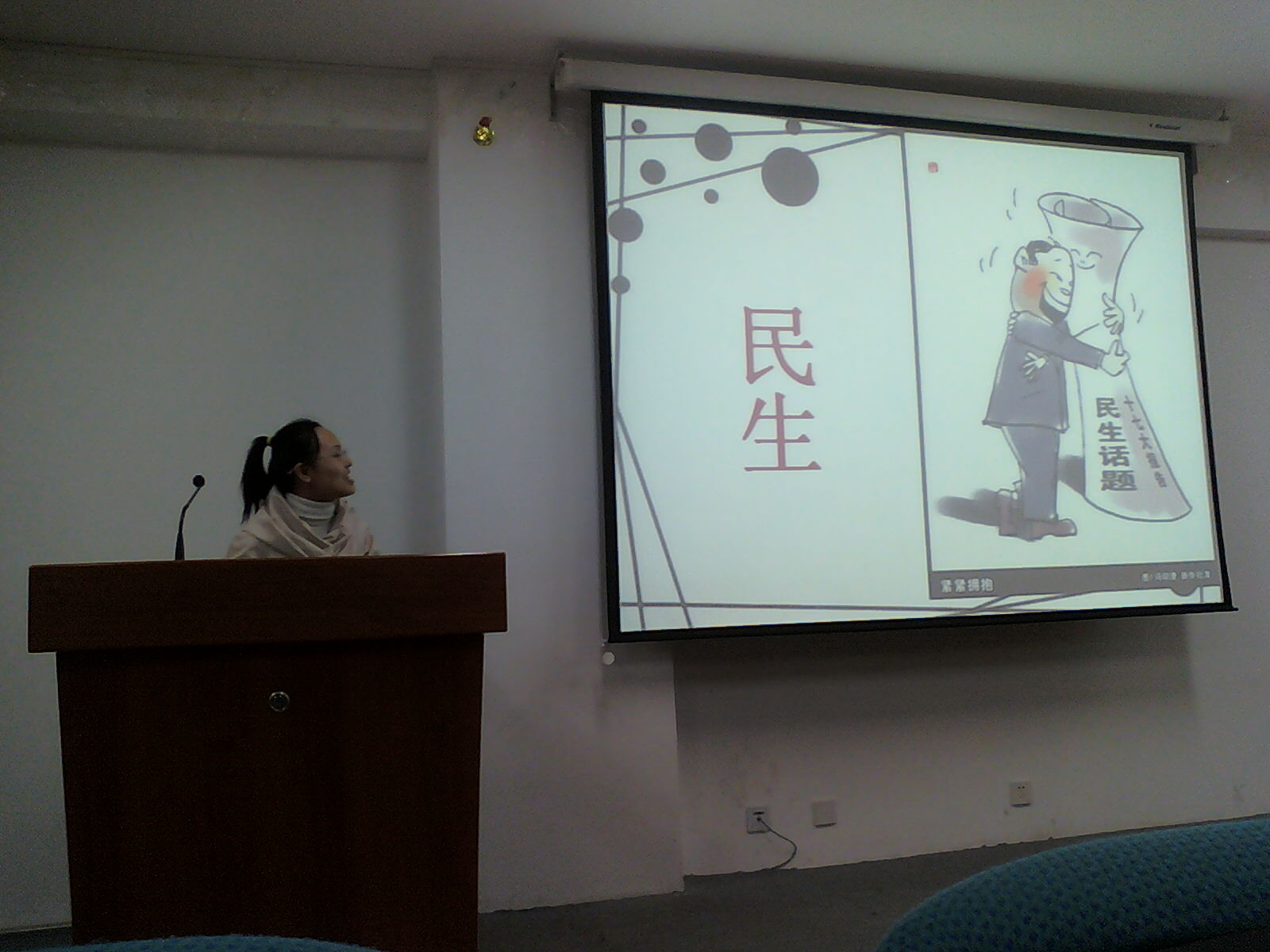 两位主讲人以PPT多媒体形式首先向大家大略介绍了“两会”的基本情况,相互配合分工合作之下有大入小、抽丝剥茧地由民主民生联系到我们即将面临、紧迫性的就业问题,重点提出了“人口红利”和“脑体倒挂”两个概念,将不久的未来中国社会人才需求结构转型及大学生较为严峻的就业现实摆在了我们的眼前。紧接着,支秀英同学引导大家对近期有争议的、引起广泛关注的热点话题进行了相互交流与讨论,各位党员同志和积极分子们就此纷纷表达意见;随着科技的普及、通讯手段的进步,大家通过网络等平台与“两会”之间的距离拉近了,而这些热点、争议点的出现也正反映出了中国大众在积极参政、议政,其本身便是社会的进步。最后,韩榕辅导员根据最近发生大家身边的现象引导大家思考并讨论,如何面对当今全球以及我国的热门话题,总结出面对这些问题我们应该首先要进行理性思考和验证,不可偏听偏信,盲从对待。同时也提出了“时势造英雄”,社会现实的考验与变革是对真金的再次试验,对于专业本领过硬的毕业生而言,坎坷也意味着机遇和动力。会议最后,韩导也提出希望党员、积极分子的在今后生活、工作和学习中要进一步发挥党员的先锋表率作用,牢记党员宗旨,积极为同学、为人民服务,成为一名优秀的党员。