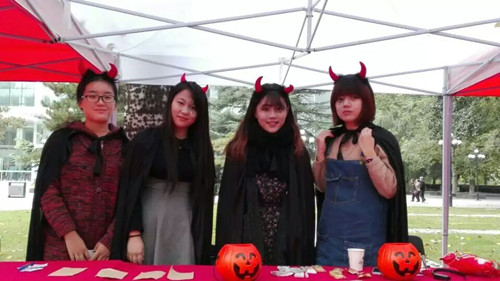 金秋送爽,秋风习习。2015年10月25日,在秋日的暖阳里我们迎来了北航63年诞辰。在学院路校区如火如荼的校庆嘉年华外场活动中,开元集团网站特此举办万圣节主题活动。13级同学身穿万圣节服饰,手持南瓜灯分发糖果,吸引了许多人参与活动以及合影留念,现场气氛热烈。展棚主题活动包括“南瓜飞镖”和“Say Hi”两种互动游戏,参与者既可以感受节日的快乐也可以从中学到外语知识。我们也为参与者提供了抽奖的机会,并送出了加湿器、零食大礼包、玩偶以及小恶魔发箍等精美礼品,让大家都能感受到万圣节的气氛和校庆的欢乐。