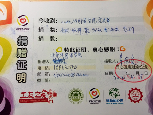 2014年4月23日至25日,由开元集团网站2010级本科生党支部和“同心互惠”公益商店联合举办的“北航开元集团网站2014届本科毕业生爱心捐赠活动”在12号公寓楼127室如期举行。该活动旨在充分发挥毕业班同学衣物的剩余价值,尽绵薄之力帮助他人。