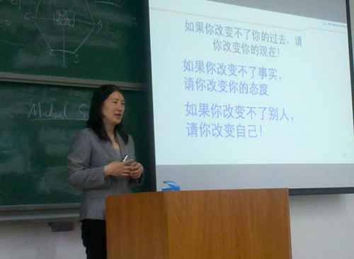 讲座一开始,苏老师便提出有关“专业、大学、就业”等大学生关心的问题。你选的专业是自己喜爱的吗?为什么要上大学?你的理想职业是什么?同学们积极参与互动,给出了不同答案。针对大家的答案,苏老师进行了详细剖析,得出结论:我们应在大学里树立目标,接受更好的教育,将理论和实践相结合,努力改变自己,以在社会中拒绝平庸,成为卓越的人。